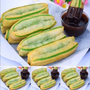 • นำส่วนผสมเเป้งใส่ที่บีบเเล้วบีบใส่ถาดเป็นเส้นยาว ประมาณ 6 เซนติเมตร หรือเป็นทรงกลม นำไปอบที่อุณหภูมิ 190 องศาเซลเซียส เป็นเวลา 25 นาที ใช้ไฟบน-ล่าง หลังจากที่อบเสร็จเเล้วให้พักในเตาก่อน เเง้มเตาเพื่อปรับอุณหภูมิก่อนนำขนมออกจากเตาอบสัก 10 นาที ขนมจะได้ไม่เเฟบ เเล้วค่อยมาพักต่อข้างนอกค่ะ หลังจากนั้นเราก็เจาะรูขนมเปิดทางเพื่อที่จะบีบไส้คัสตาร์ดเเละไส้สังขยาใบเตยเข้าไป เเละก็บีบไส้ใส่ขนมจนเต็ม เป็นอันเสร็จค่ะ